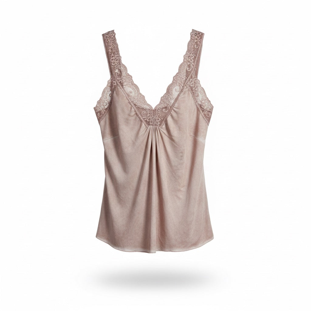 Entdecke dein neues Lieblings-Basic in einem zarten Rosaton! Dieses charmante Top aus fließender 100 % Viskose besticht durch seine zarte Spitzenverzierung am V-Ausschnitt und an den Trägern.